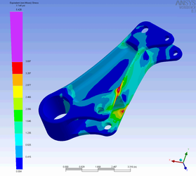 FEA analysis can be used to evaluate how efficiently material within a part is utilized. Under stressed areas can be lightened and highly stressed regions reinforced. Colors on the part represent both stress level and stress gradient. Very low stress means the part is not efficient - it's heavier than it needs to be. High stress may suggest short service life or low stiffness. This part as originally designed has low stress regions, high stress points and high stress gradients. We were able to both strengthen and lighten this part by removing material from the blue areas and adding a little near the red.