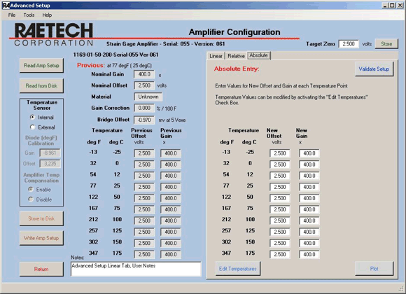 The Advanced configuration screen displays user defined temperature dependent Gain and Offset. Several tools are provided to aid table creation. Data can be entered in a point slope format for linear relationships or as relative changes to a previous configuration. Alternately, the tables can be edited directly. The tabular data is displayable as a graph. Setups can be stored and recalled from disk files.